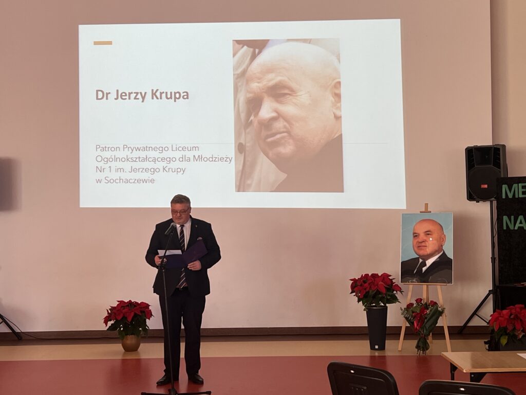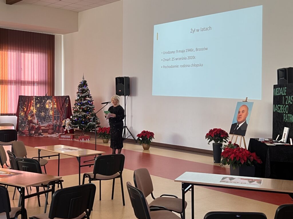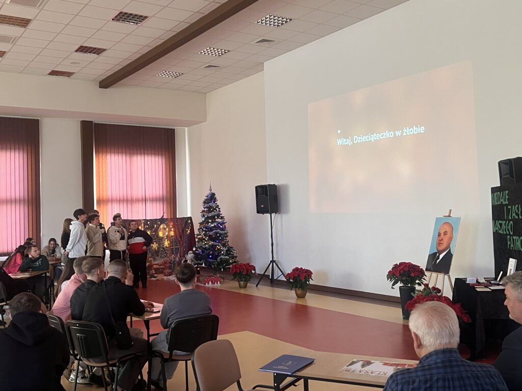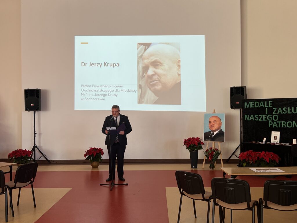8 grudnia 2025r. w naszej szkole odbył y się uroczyste obchody Dnia Patrona dr. Jerzego Krupy. Swoją obecnością zaszczycili nas najbliżsi Patrona: żona pani Helena Krupa oraz syn pan Dariusz Krupa wraz z żoną. Uroczystość rozpoczęła się częścią oficjalną, podczas której przemówienia wygłosili pani Dyrektor oraz pan Dariusz Krupa. Następnie przybliżona została biografia dr. Jerzego Krupy. Pan Dariusz Krupa podziękował w imieniu swoim oraz całej rodziny za pielęgnowanie pamięci o dr. Jerzym Krupie, która pozostaje żywą inspiracją dla kolejnych pokoleń. Wyraził również wdzięczność za wychowanie młodzieży w duchu odpowiedzialności, pracowitości oraz wrażliwości na drugiego człowieka wartości szczególnie bliskie Patronowi szkoły. Po części oficjalnej przyszedł czas na emocjonujący quiz wiedzy o naszym Patronie oraz tradycji bożonarodzeniowych. W rywalizacji wzięło udział pięciu przedstawicieli z każdej klasy, a do gry przystąpiło 7 klas.