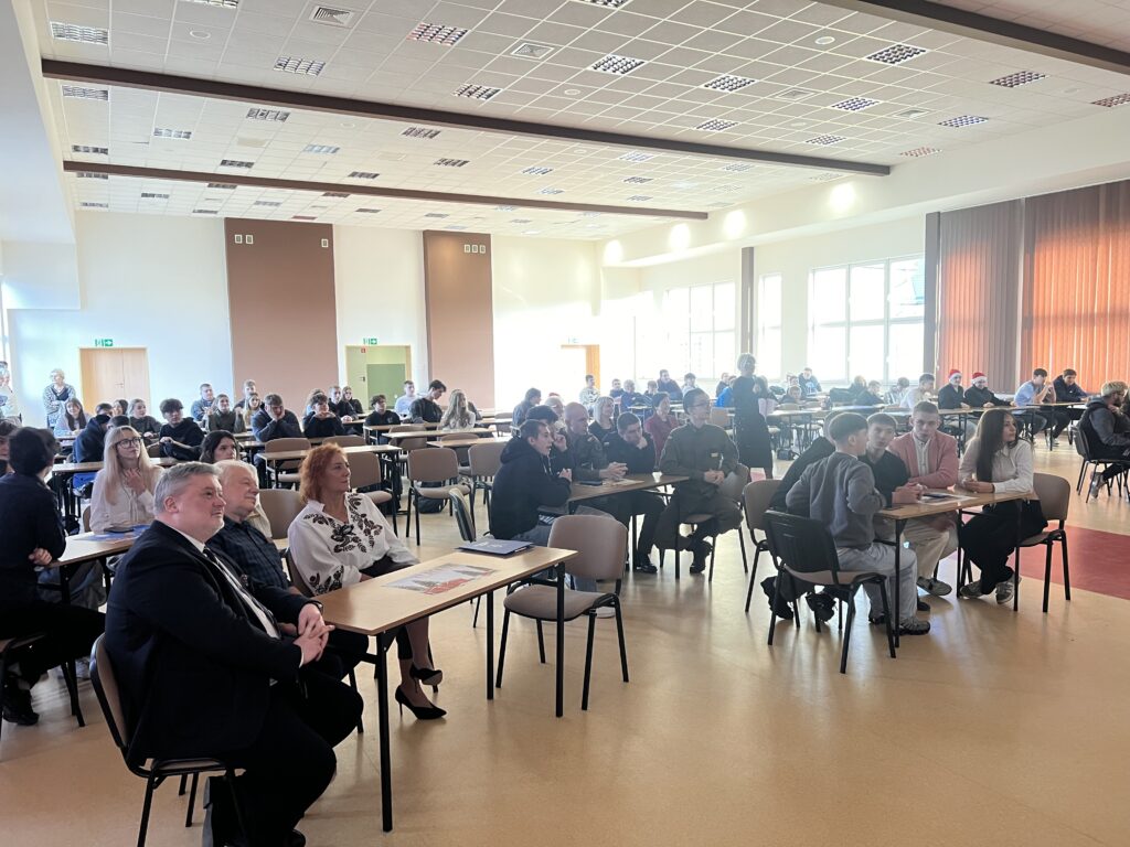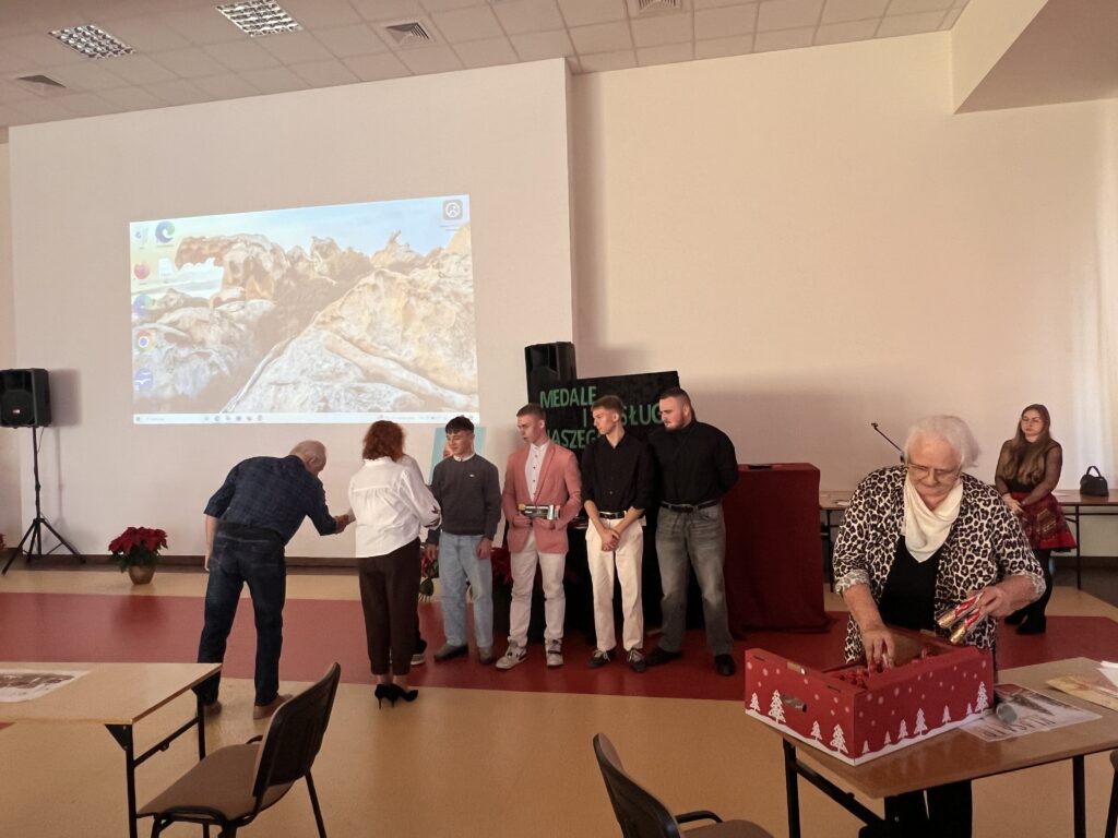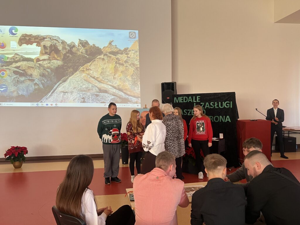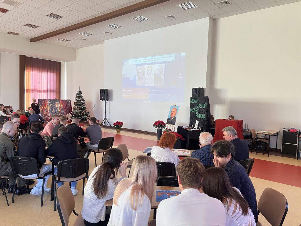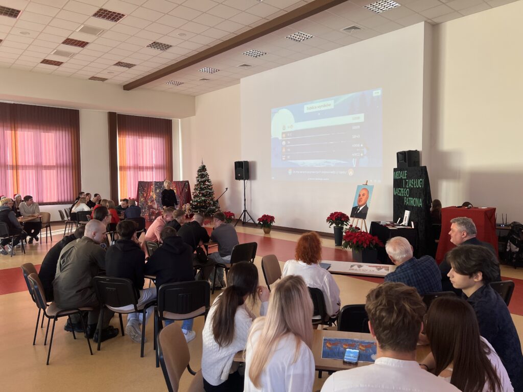 8 grudnia 2025r. w naszej szkole odbył y się uroczyste obchody Dnia Patrona dr. Jerzego Krupy. Swoją obecnością zaszczycili nas najbliżsi Patrona: żona pani Helena Krupa oraz syn pan Dariusz Krupa wraz z żoną. Uroczystość rozpoczęła się częścią oficjalną, podczas której przemówienia wygłosili pani Dyrektor oraz pan Dariusz Krupa. Następnie przybliżona została biografia dr. Jerzego Krupy. Pan Dariusz Krupa podziękował w imieniu swoim oraz całej rodziny za pielęgnowanie pamięci o dr. Jerzym Krupie, która pozostaje żywą inspiracją dla kolejnych pokoleń. Wyraził również wdzięczność za wychowanie młodzieży w duchu odpowiedzialności, pracowitości oraz wrażliwości na drugiego człowieka wartości szczególnie bliskie Patronowi szkoły. Po części oficjalnej przyszedł czas na emocjonujący quiz wiedzy o naszym Patronie oraz tradycji bożonarodzeniowych. W rywalizacji wzięło udział pięciu przedstawicieli z każdej klasy, a do gry przystąpiło 7 klas.