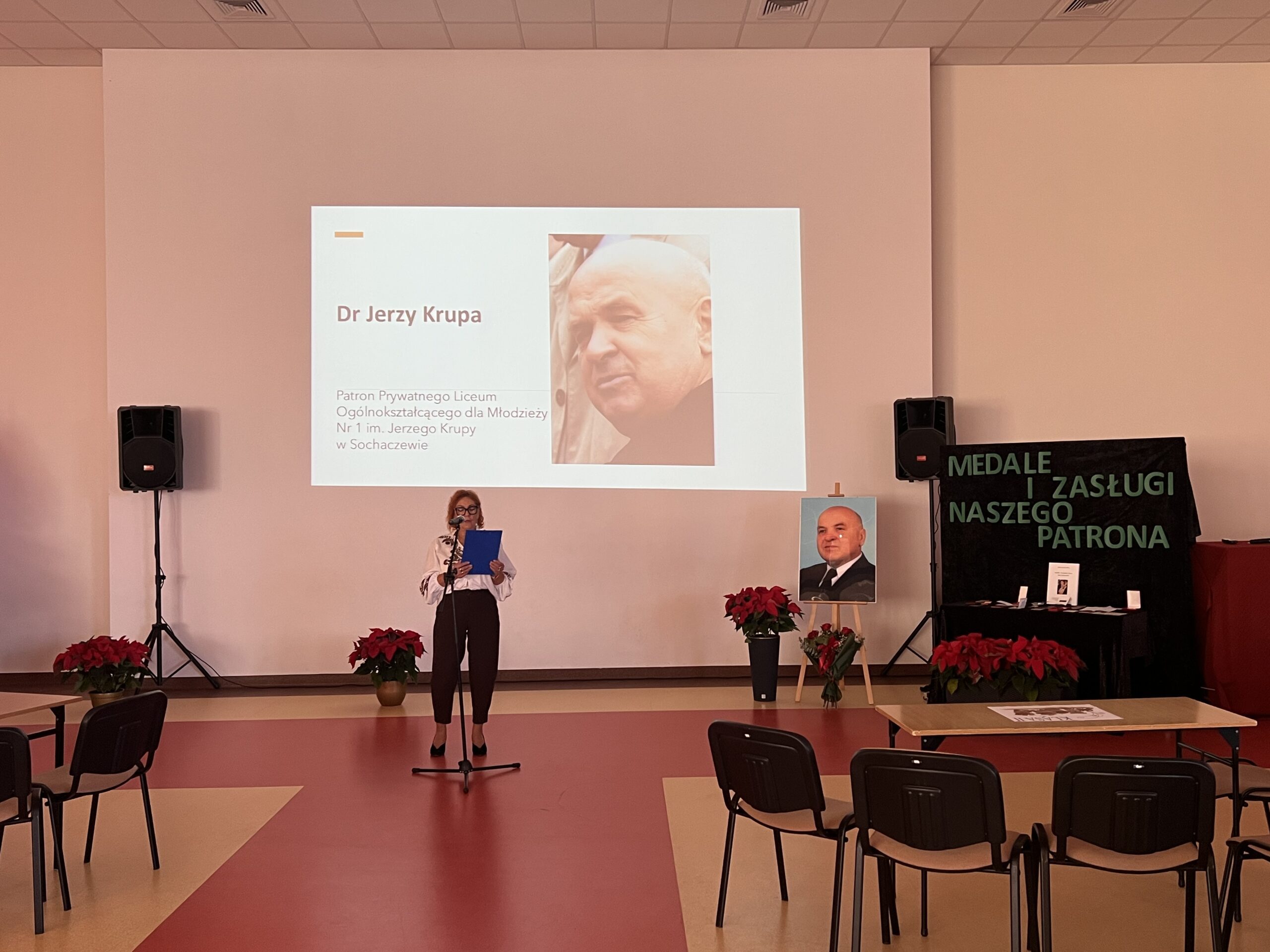 8 grudnia 2025r. w naszej szkole odbył y się uroczyste obchody Dnia Patrona dr. Jerzego Krupy. Swoją obecnością zaszczycili nas najbliżsi Patrona: żona pani Helena Krupa oraz syn pan Dariusz Krupa wraz z żoną. Uroczystość rozpoczęła się częścią oficjalną, podczas której przemówienia wygłosili pani Dyrektor oraz pan Dariusz Krupa. Następnie przybliżona została biografia dr. Jerzego Krupy. Pan Dariusz Krupa podziękował w imieniu swoim oraz całej rodziny za pielęgnowanie pamięci o dr. Jerzym Krupie, która pozostaje żywą inspiracją dla kolejnych pokoleń. Wyraził również wdzięczność za wychowanie młodzieży w duchu odpowiedzialności, pracowitości oraz wrażliwości na drugiego człowieka wartości szczególnie bliskie Patronowi szkoły. Po części oficjalnej przyszedł czas na emocjonujący quiz wiedzy o naszym Patronie oraz tradycji bożonarodzeniowych. W rywalizacji wzięło udział pięciu przedstawicieli z każdej klasy, a do gry przystąpiło 7 klas.